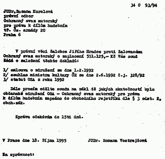| Žaloba č. 1 - žádosti soudkyně Městský soud v Praze 18.10.1995, právní chaos OSA Jiří Hradec proti OSA - spor proti neproplácení za užití hudby |