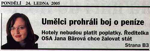 | Související téma: | autorský zákon - novela | neidentifikovatelné příjmy OSA | kampaň OSA proti novele AZ | | Bärová - nová ředitelka OSA | tisk o OSA | |
